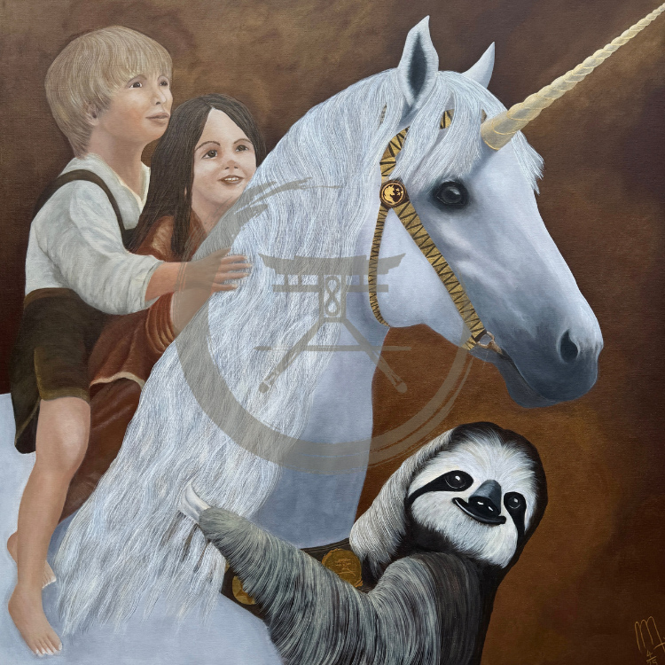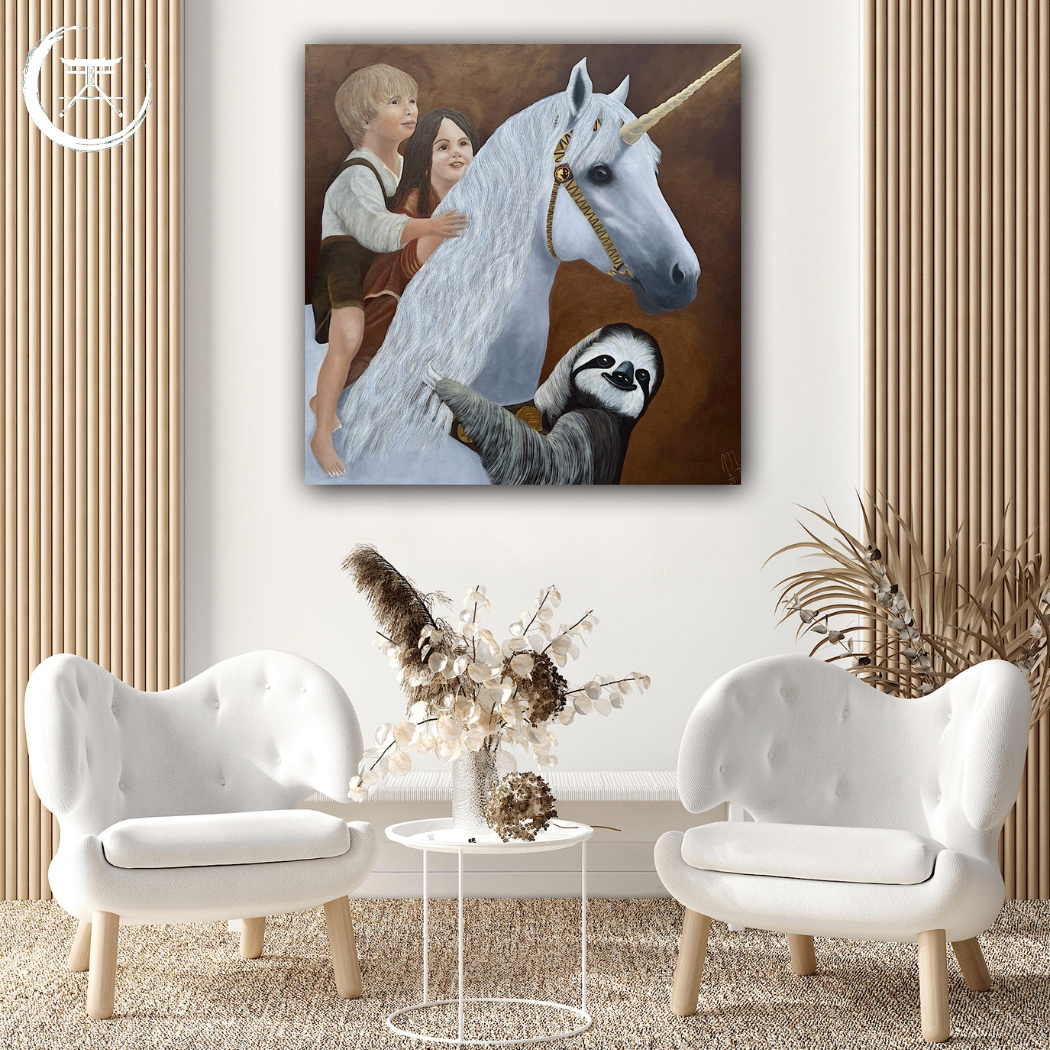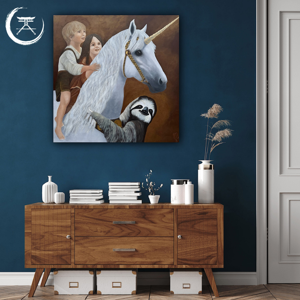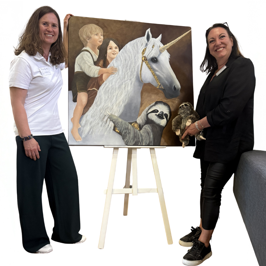 Beschreibung der Künstlerin: »Dieses Bild ist inspiriert von der Vision der Stiftung Gewaltfreie Kindheit, die an eine Kindheit glaubt, die schützt, nährt und stärkt. An ein Aufwachsen ohne Angst – in dem Kinder gehört, begleitet und verstanden werden. Eine Welt, in der Erziehung kein Machtmittel, sondern Beziehung ist. Das weiße Einhorn, dem Stiftungslogo entnommen, steht sinnbildlich für das Magische, Reine und Unversehrte. Behutsam trägt es zwei Kinder auf seinem Rücken – ihr Blick ist voller Vertrauen, ihre Nähe voller Wärme. Frieda, das Stiftungsmaskottchen – ein sanftes, tief in sich ruhendes Faultier – schmiegt sich um den Hals des Einhorns. Sie verkörpert den Rhythmus der Stille – nicht im Takt der Welt, sondern im Einklang mit sich selbst. Ihre Kraft liegt nicht im Tun, sondern im Vertrauen: darauf, dass das Leben trägt – auch dann, wenn sie ihr eigenes Tempo wählt. Eine stille Erinnerung daran, dass wahre Entwicklung Zeit braucht.«